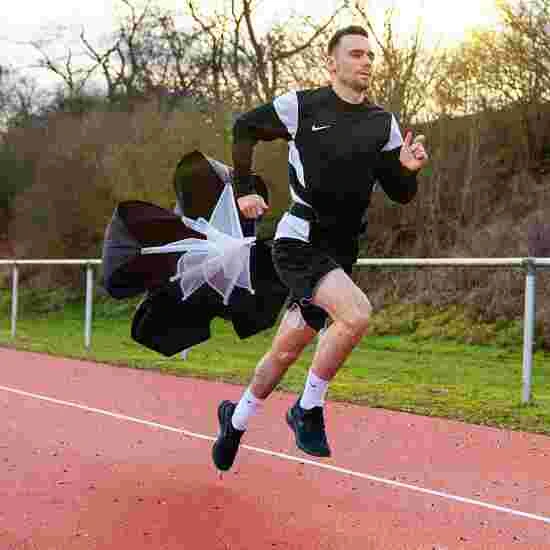 The Vinex “Premium” speed chute is made of polyester, making it particularly light. Using the sprint parachute, you can strengthen your leg muscles and thus increase acceleration, explosiveness and speed. No need for a training partner to use the chute. The padded, size-adjustable hip belt connects the runner with the parachute. This in turn increases the air resistance by approx. 10–15 kg, depending on the running speed.